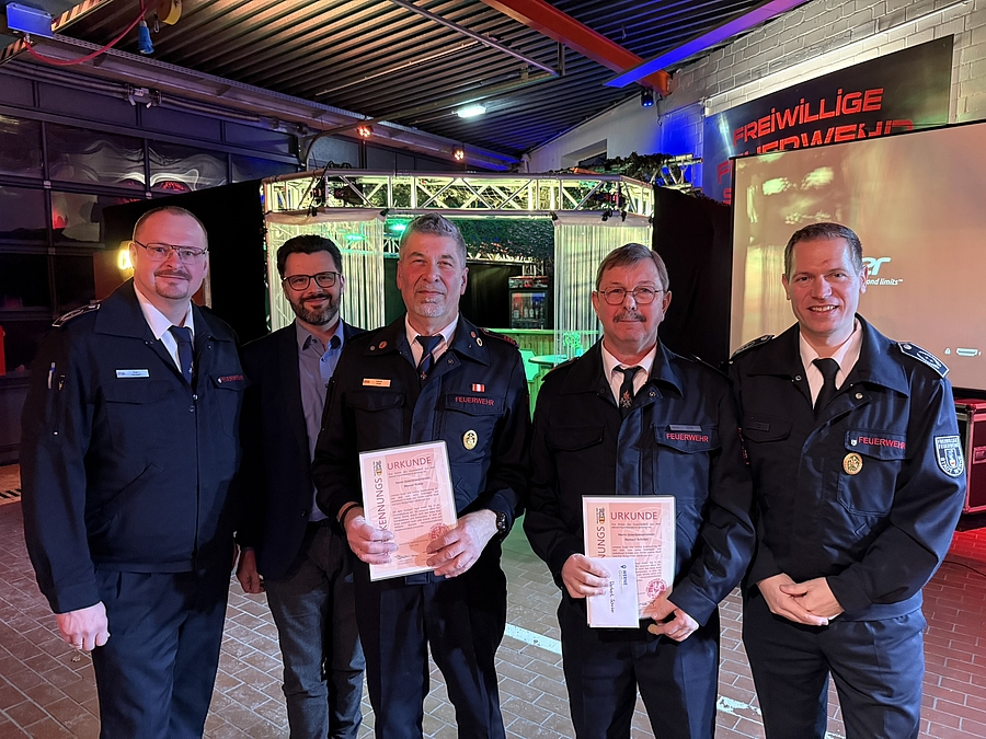 Das Feuerwehr-Ehrenzeichen in Gold für 35 Jahre Mitgliedschaft erhielten Ronald Conradi, Harald Ernst, Michael Gillmann, Andreas Schilla und Frank Zurstraßen.