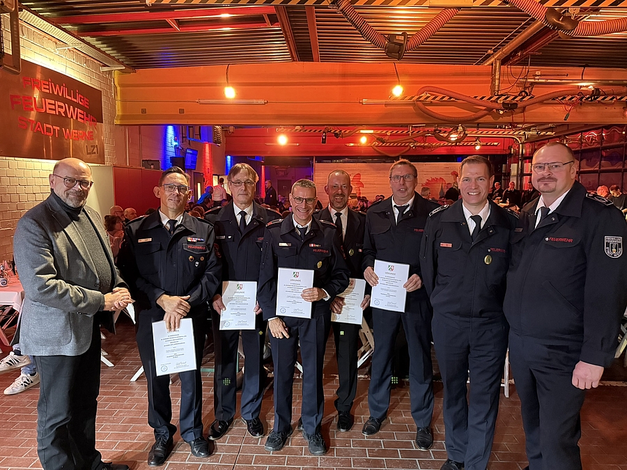 Ein besonderer Höhepunkt des Abends waren die Ehrungen verdienter Feuerwehrangehöriger. Den feierlichen Auftakt hierzu gestaltete der Spielmannszug der Freiwilligen Feuerwehr Werne, der mit mehreren Musikstücken den Rahmen für die anschließenden Auszeichnungen setzte. Die Ehrungen wurden durch Leiter der Feuerwehr Tobias Tenk, seinen Stellvertreter Sven Schubert, den Landtagsabgeordneten und 1. Vizepräsidenten des Landtags Nordrhein-Westfalen Rainer Schmeltzer sowie Bürgermeister Lars Hübchen vorgenommen.