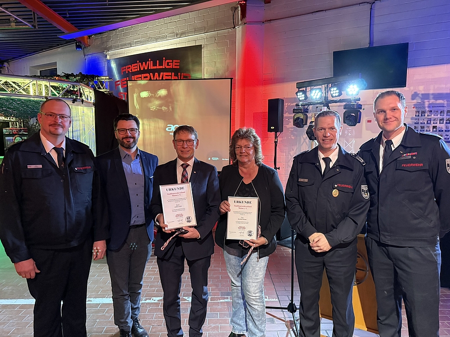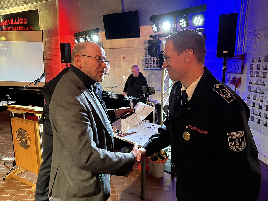 Eine besondere Würdigung erhielten zudem der ehemalige Bürgermeister Lothar Christ sowie die in Kürze in den Ruhestand wechselnde Feuerwehrdezernentin Kordula Mertens. Sie wurden zum Ehrenbrandmeister beziehungsweise zur Ehrenbrandmeisterin ernannt und damit offiziell in die Ehrenabteilung der Freiwilligen Feuerwehr Werne aufgenommen – eine Auszeichnung, die die langjährige und vertrauensvolle Zusammenarbeit mit der Stadt Werne unterstreicht.