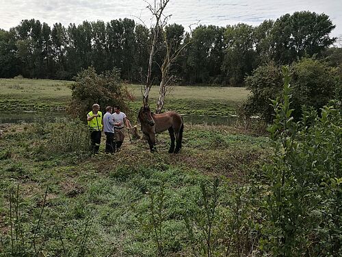 Das Tier war bereits unterkühlt und schwach, so dass es den Uferaufstieg bei den schlammigen Verhältnissen und an der steilen Böschung nicht alleine bewerkstelligen konnte. Ein Trupp wurde angeleint und betreute das im Wasser liegende Pferd. Ziel war es, zunächst die Lage zu stabilisieren und den Kopf des Pferdes über Wasser zu halten, um dem Tier etwas Erholung und Beruhigung zu verschaffen.