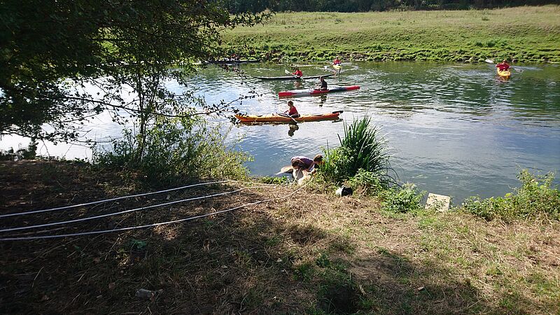 Nach einiger Suche konnte die Einsatzstelle schwer zugänglich im Bereich Gedembergstraße / Schlagt gefunden werden. Einige Kanuten und Spaziergänger standen beim Pferd, dass offensichtlich bereits über eine Stunde im Wasser gewesen war und von den Kanuten aufgefunden wurde. Diese hatten bereits versucht es auf’s Trockene zu treiben, was auch der Feuerwehr im ersten Anlauf nicht gelang.