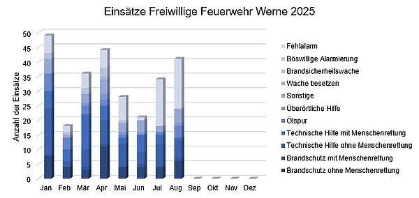 Im Jahr 2024 war erstmalig ein Rückgang der Einsatzzahlen für die Freiwillige Feuerwehr Werne erkennbar. Genau 37 Einsätze weniger hat die Wehr zu verzeichnen, was für die Belastung des Ehrenamtes positiv zu erwähnen ist. Dennoch befinden wir uns mit 482 Einsätzen im Jahr 2023 und 445 Einsätzen im Jahr 2024 auf einem hohen Niveau.